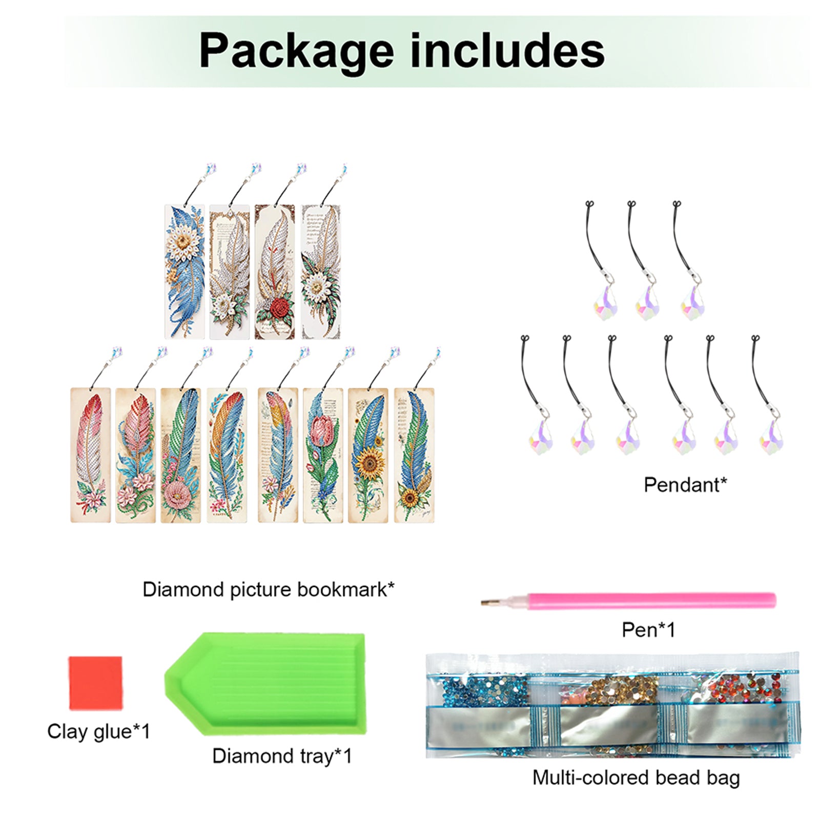 12Pcs Feathers DIY Diamond Painting Bookmark with Crystal Pendant for Readers