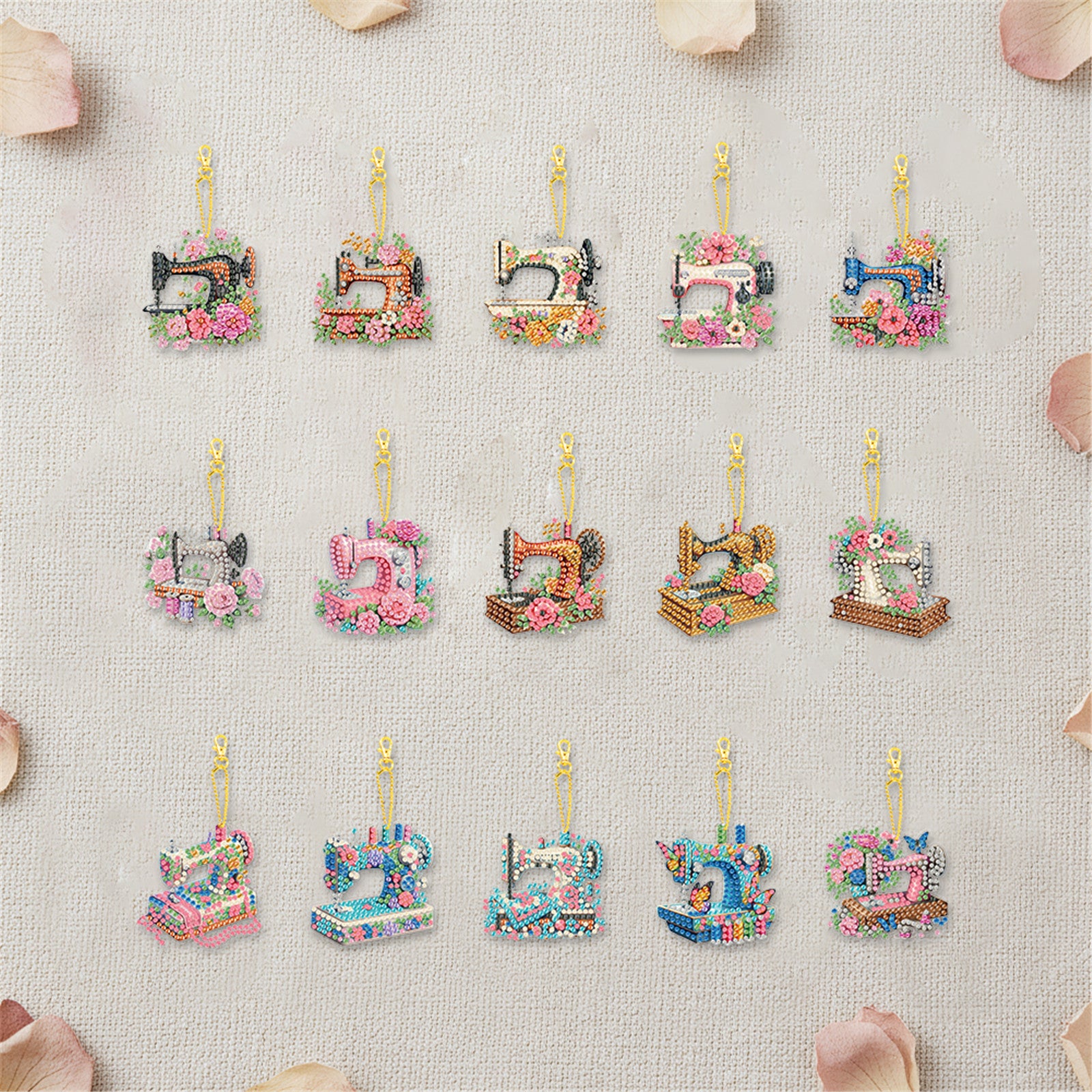 15Pcs Sewing Machine DIY Double Sided Diamond Painting Keychain Kits for Adults