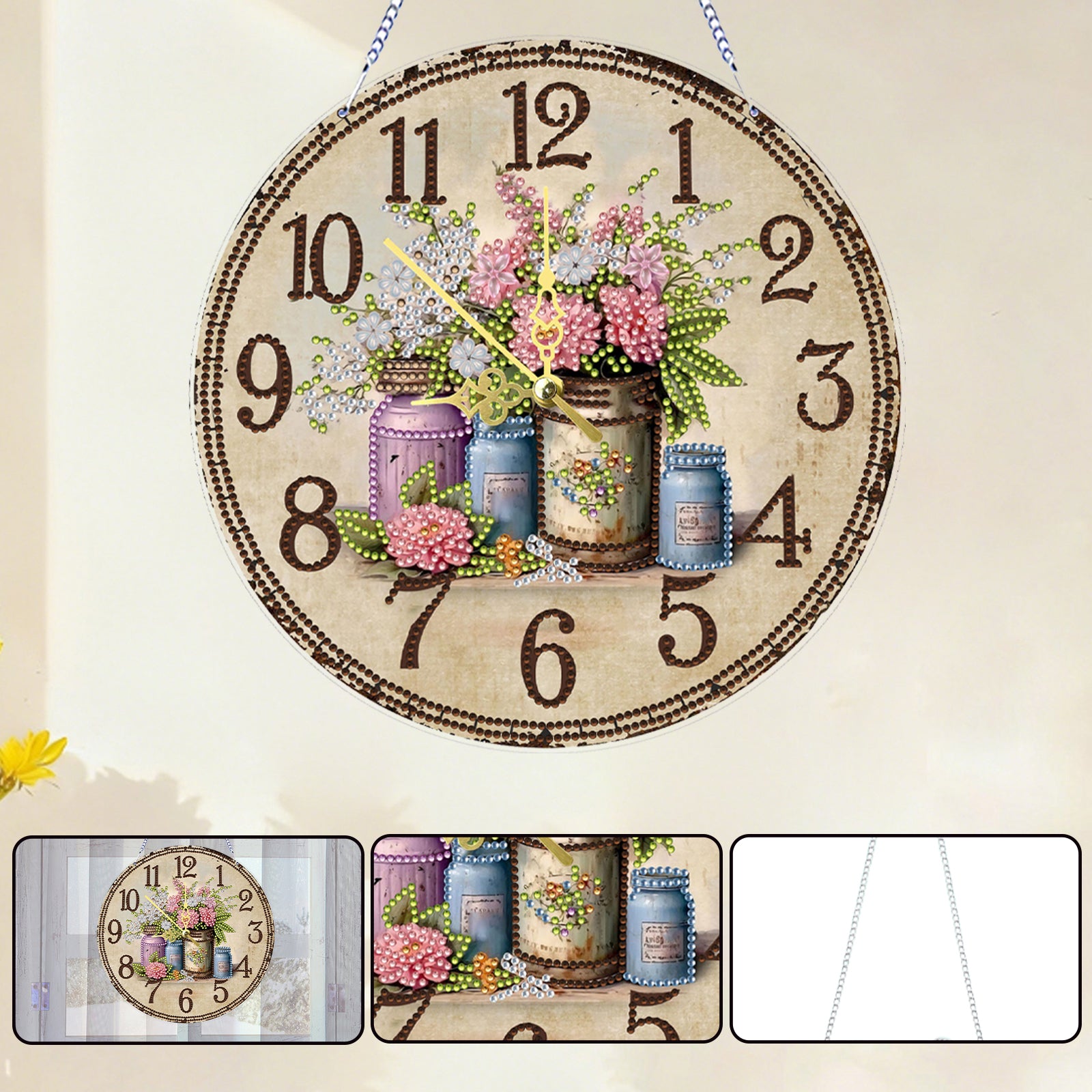 2D DIY Acrylic Vintage Vase Diamond Art Painting Clock Pendant w/ Clock Function
