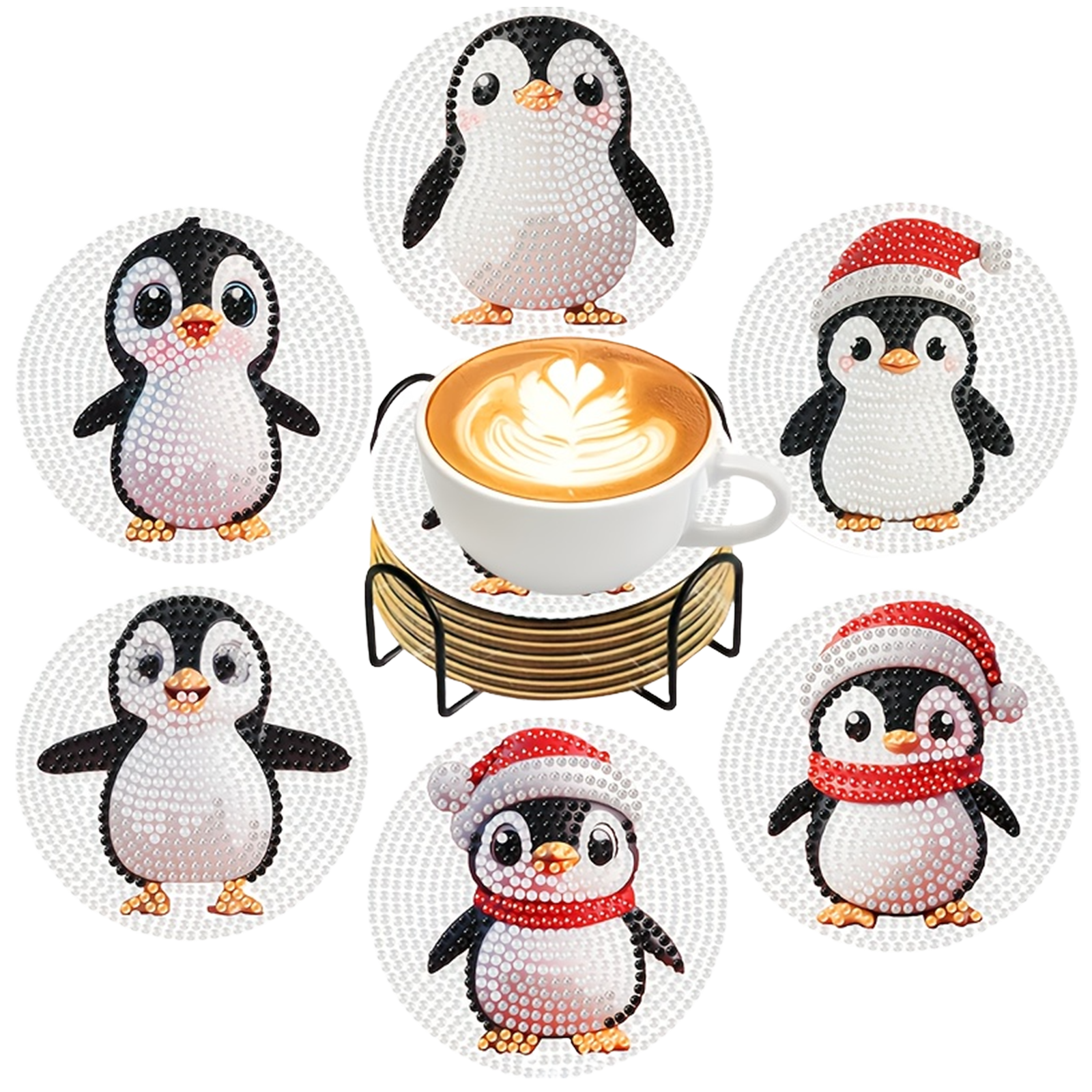 6pcs Cartoon DIY Diamond Painting Wooden Coasters Art Kits with Holder (Penguin)