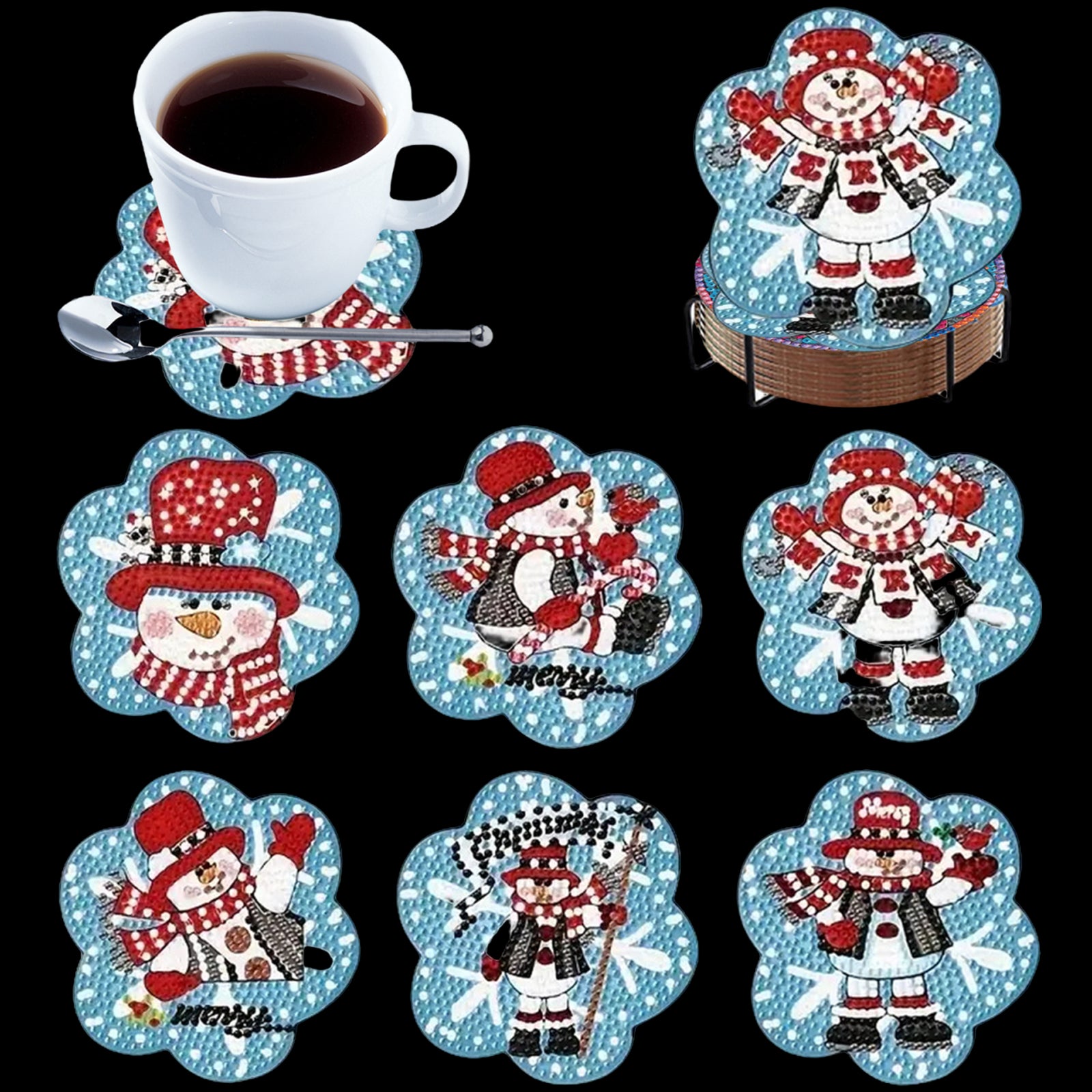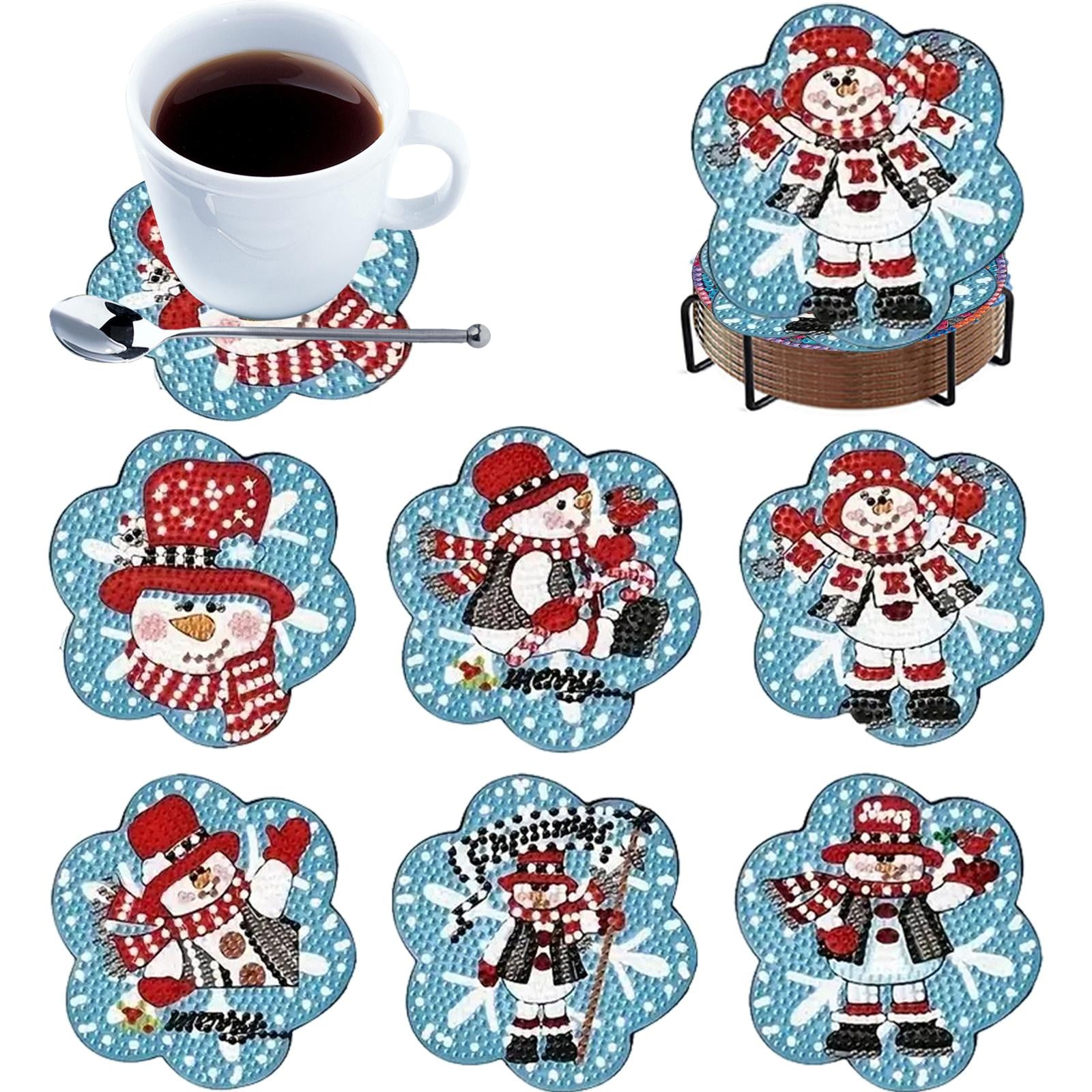 6pcs Cartoon DIY Diamond Painting Wooden Coasters Art Kits with Holder (Snowman)