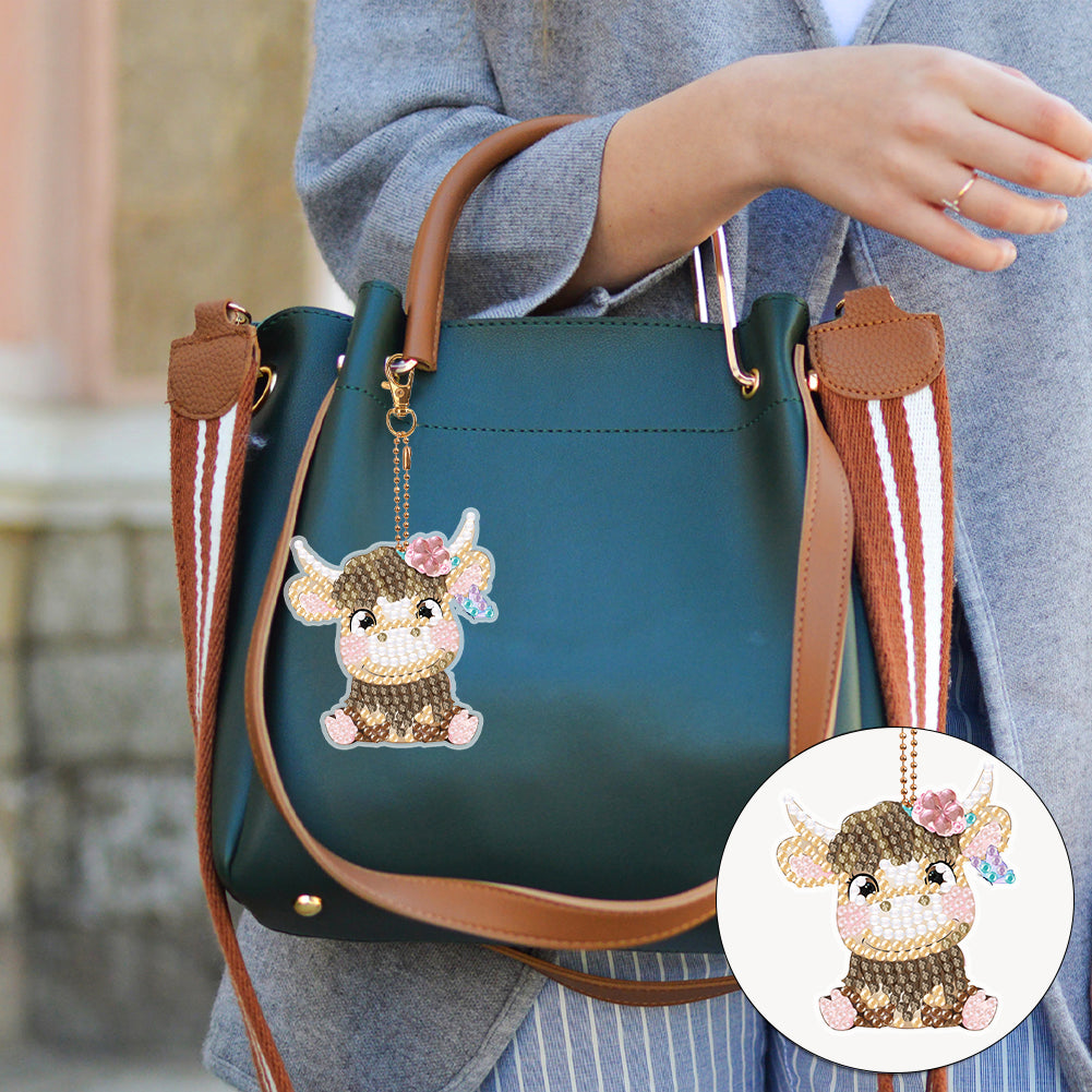 6PCS Double Sided Round Diamond Painting Art Keychain Pendant (Each Busy Cow)