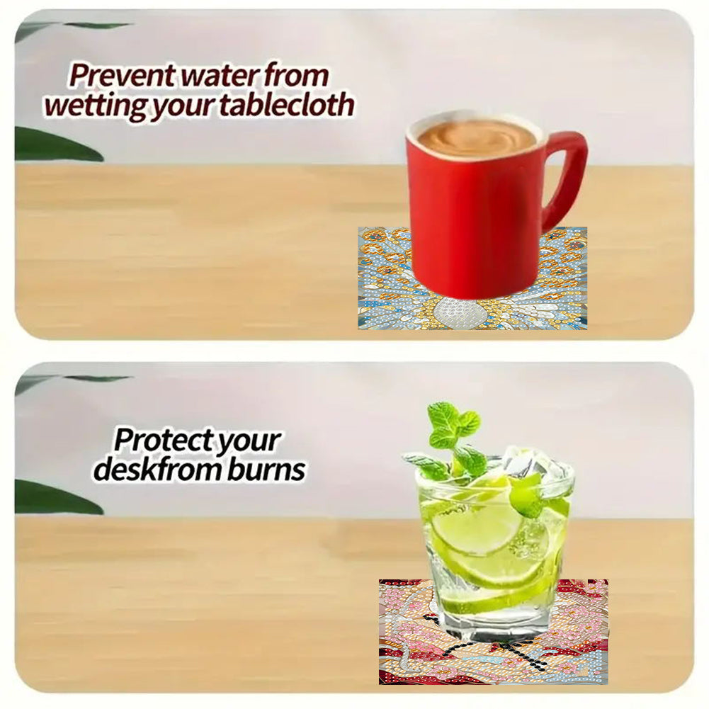 1. Perfect Fit: Our diamond painting coasters are ideally sized for your favorite coffee and tea mugs, ensuring a stable base for a variety of cup styles. They are crafted to withstand pressure, keeping your beverages secure and your surfaces protected.