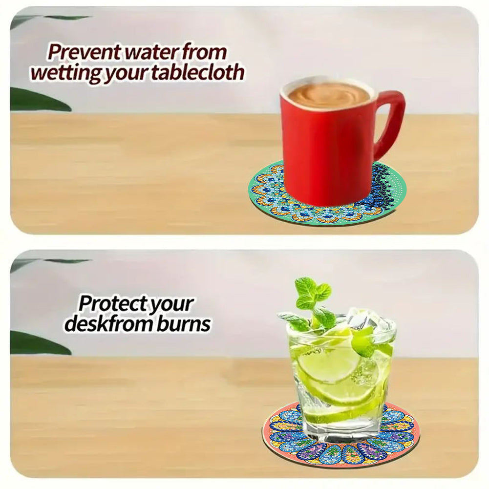 1. Perfect Fit: Our diamond painting coasters are ideally sized for your favorite coffee and tea mugs, ensuring a stable base for a variety of cup styles. They are crafted to withstand pressure, keeping your beverages secure and your surfaces protected.