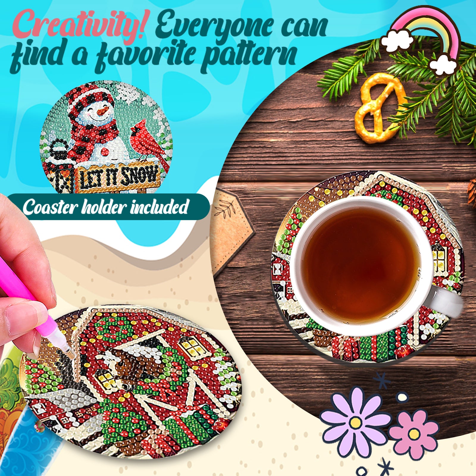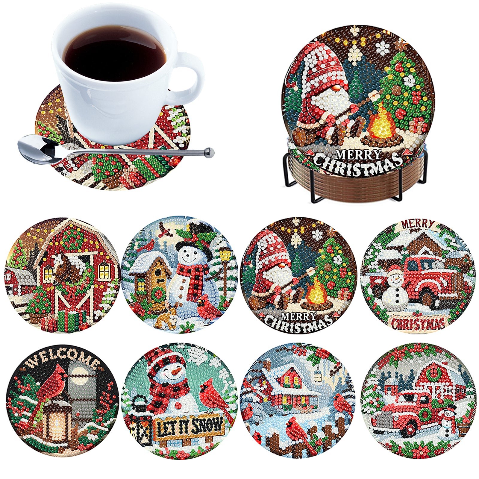 8pc Christmas Wooden DIY Coaster Diamond Art Kits with Holder No-Slip Home Decor