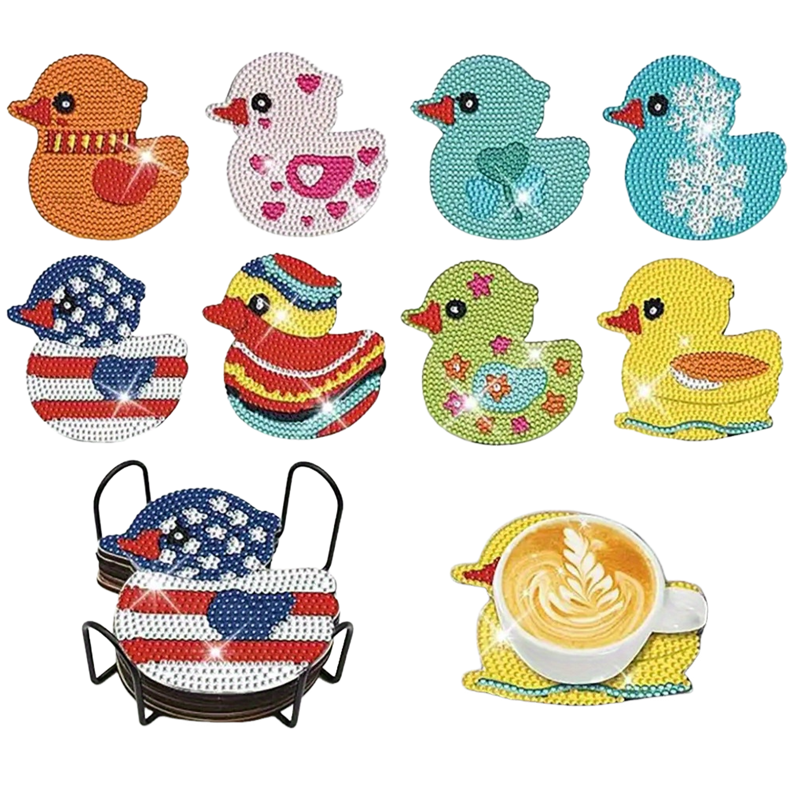 8pcs Cartoon DIY Diamond Painting Wooden Coasters Art Kits with Holder (Duck)