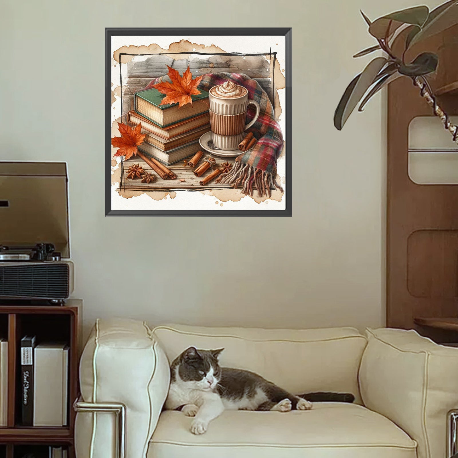 Autumn Maple Leaf Book With Hot Cocoa - Full Square Drill Diamond Painting 30*30CM