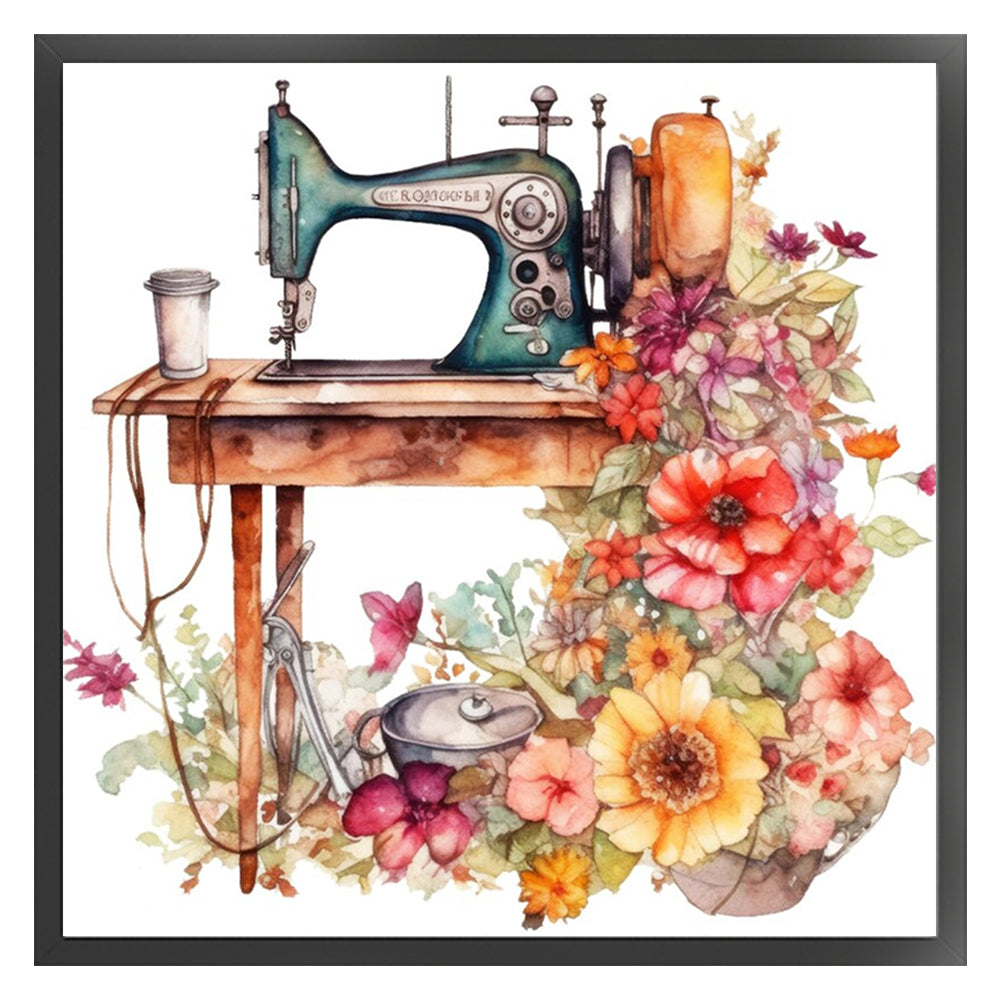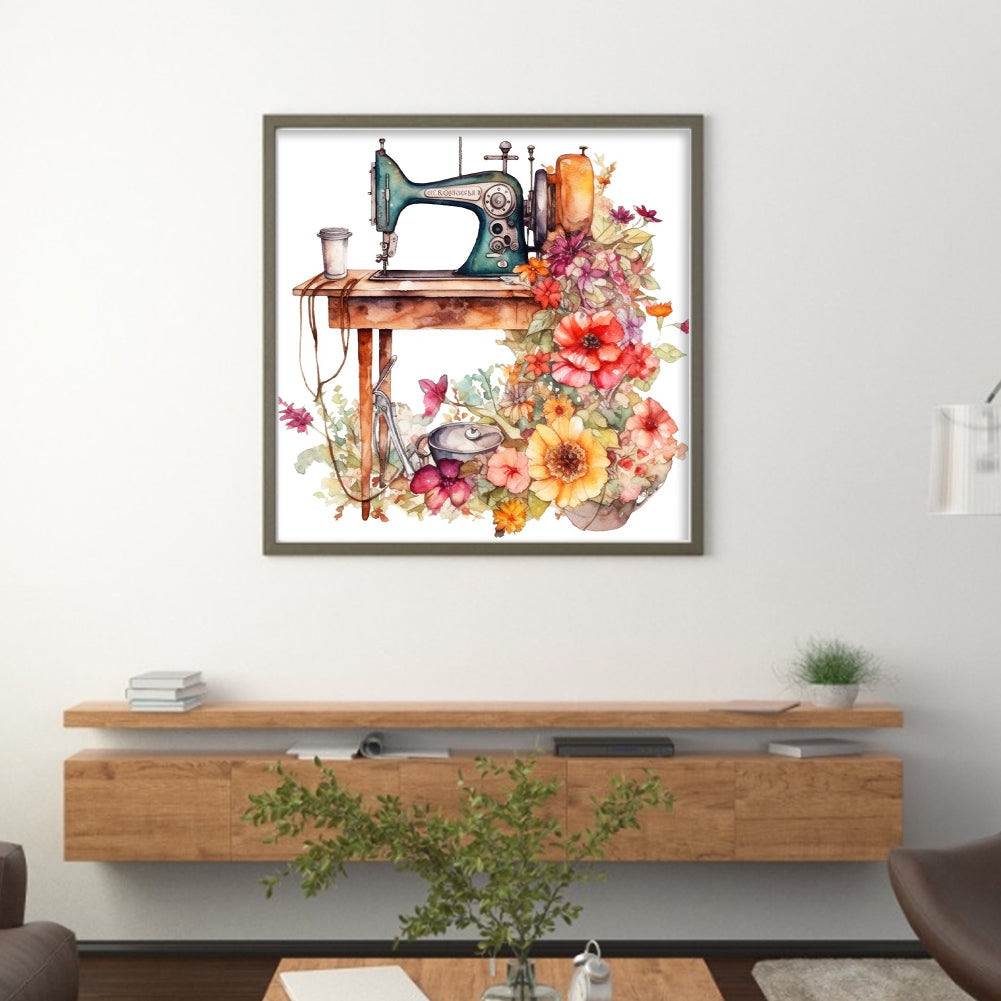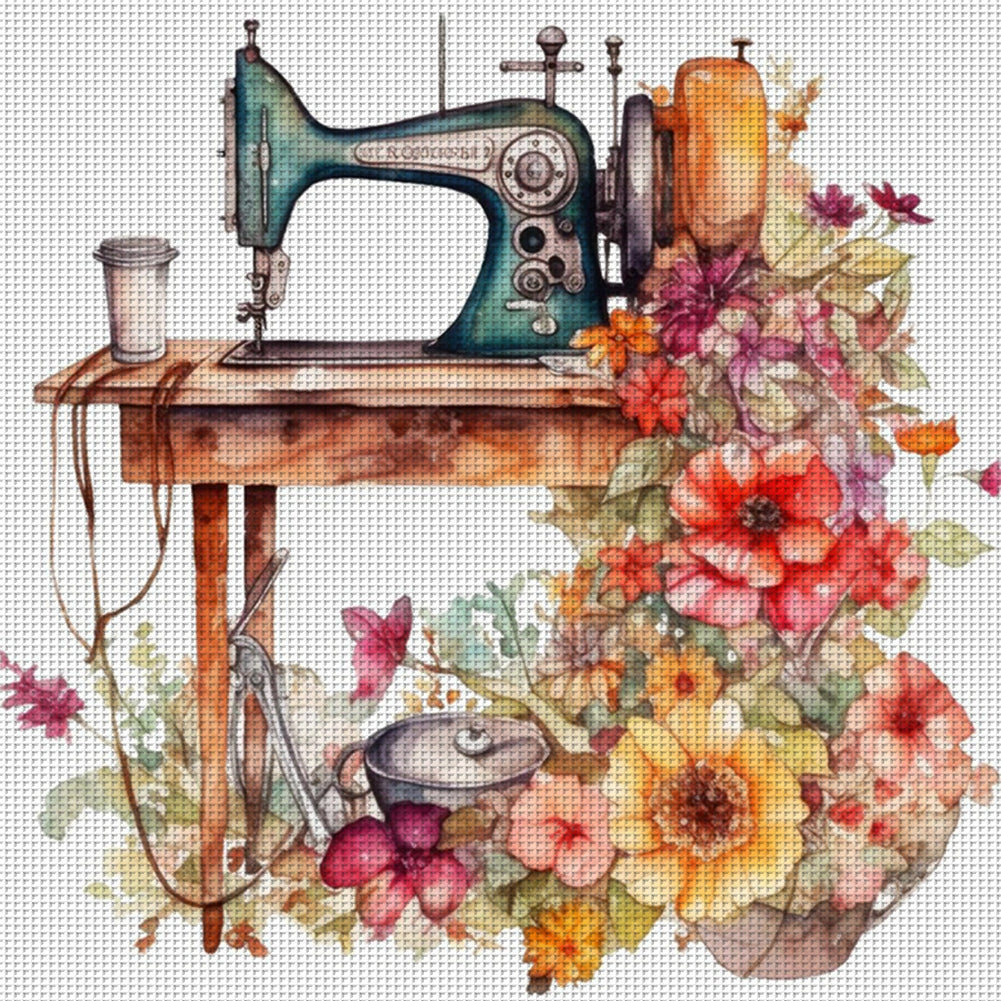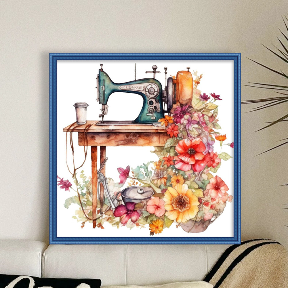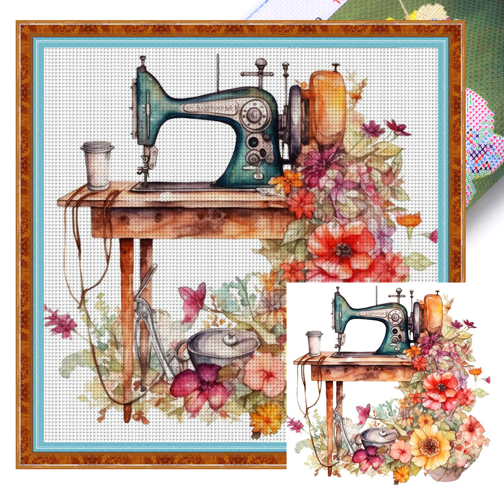 Retro Flower Sewing Machine - 14CT Stamped Cross Stitch 40*40CM