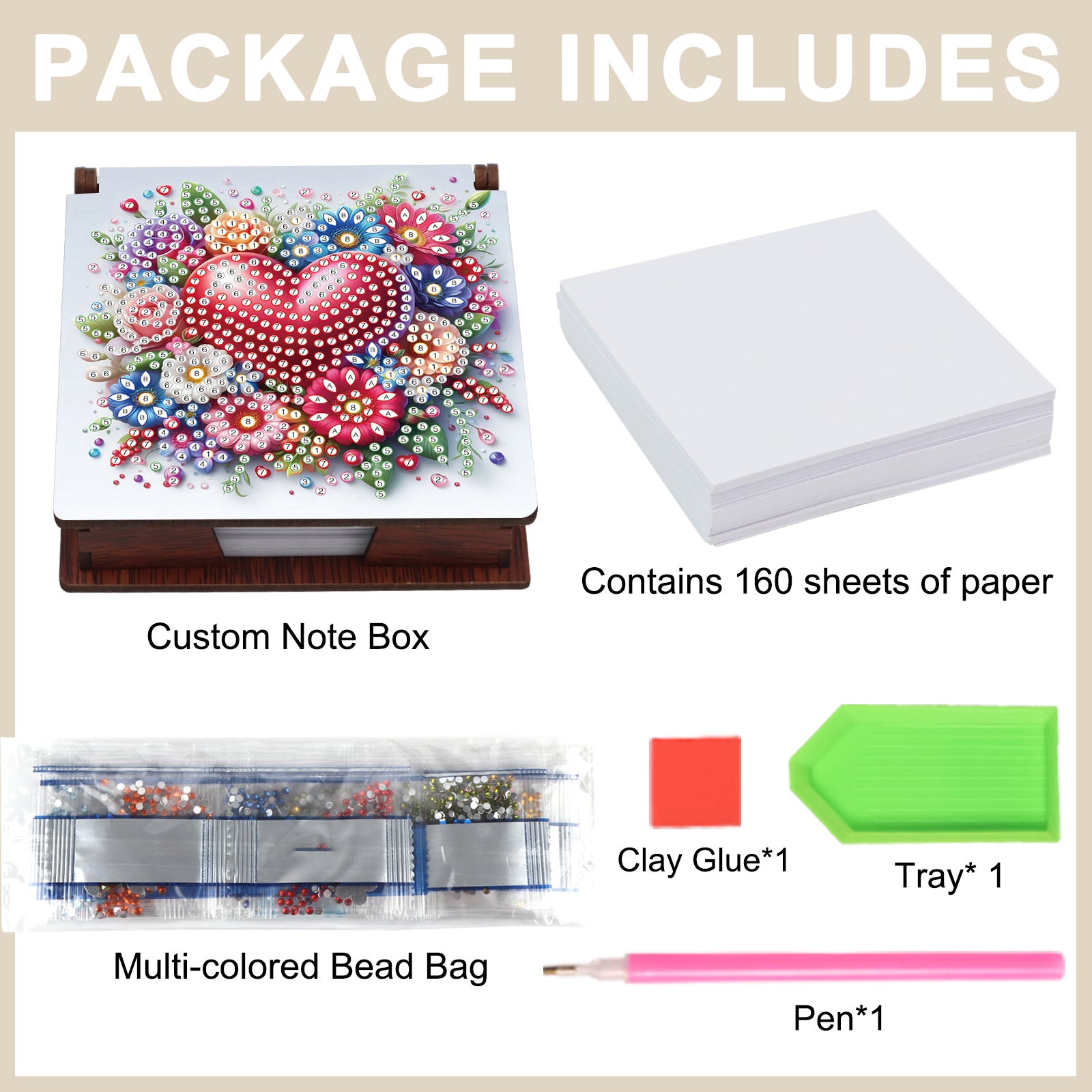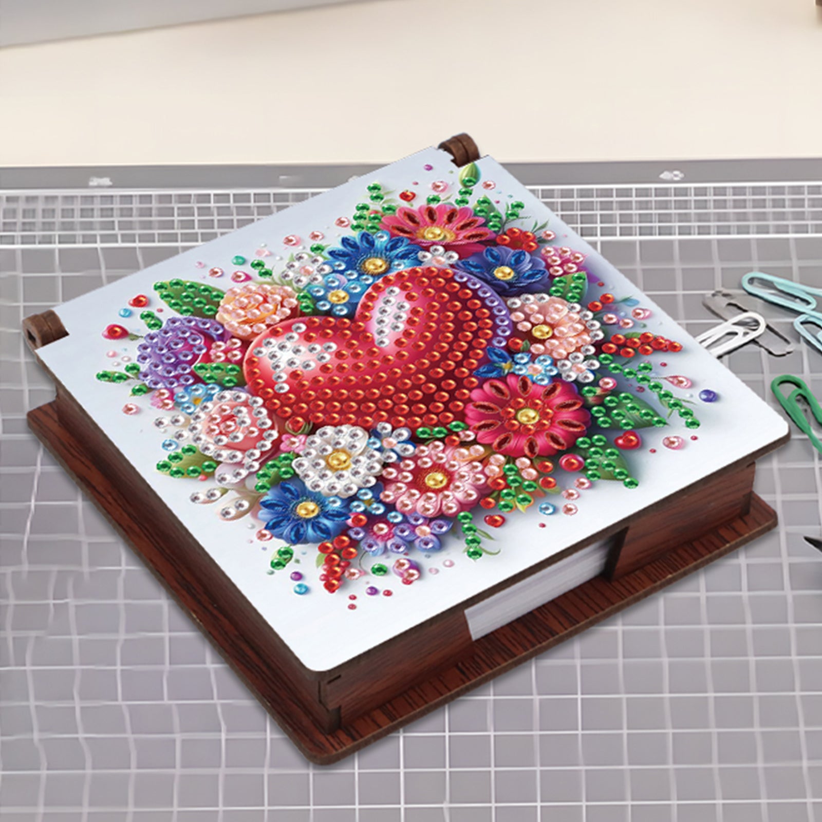 Wooden DIY Flower Heart Diamond Painting Kit Note Box with 160 Papers for Office