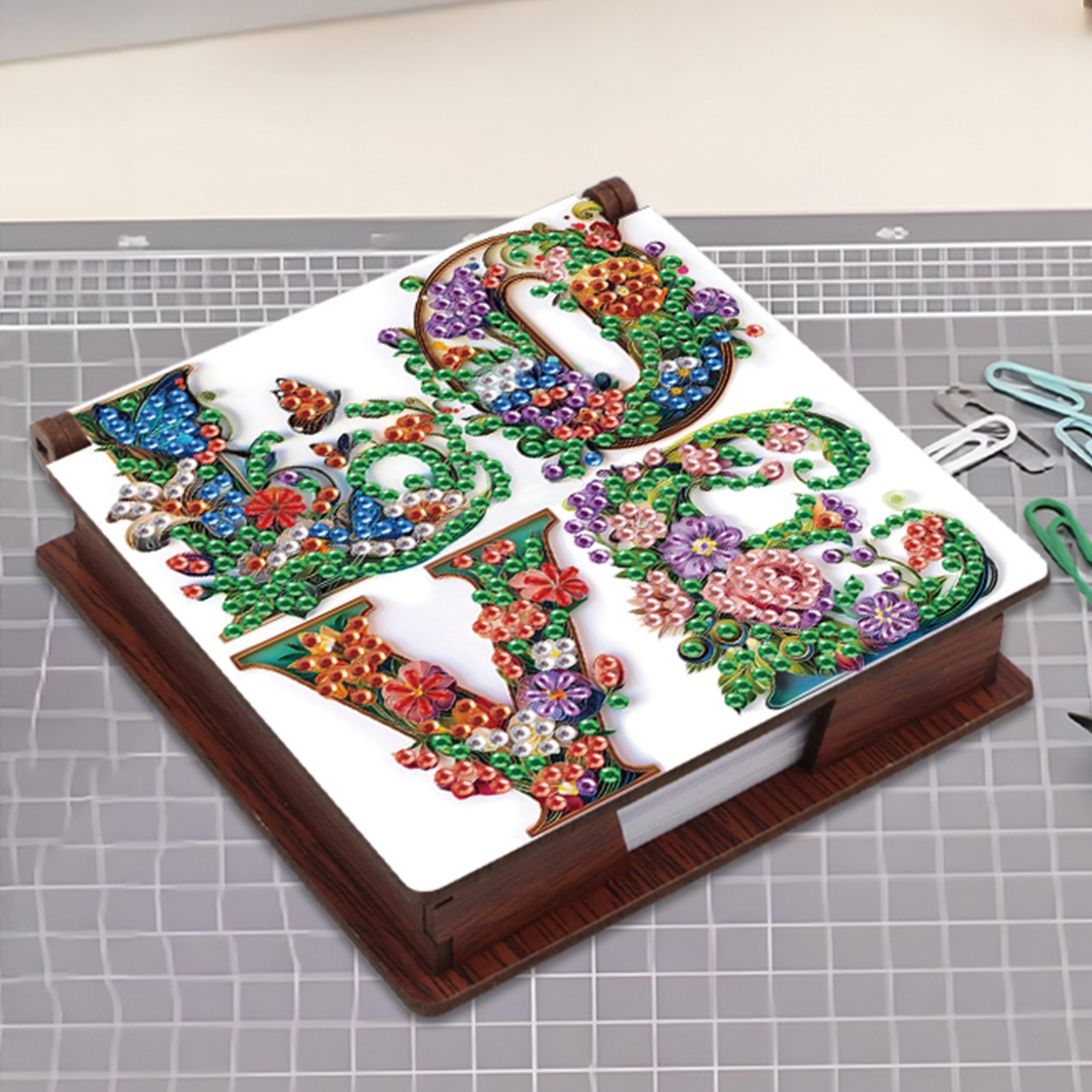 Wooden DIY LOVE Flower Diamond Painting Kit Note Box with 160 Papers for Office