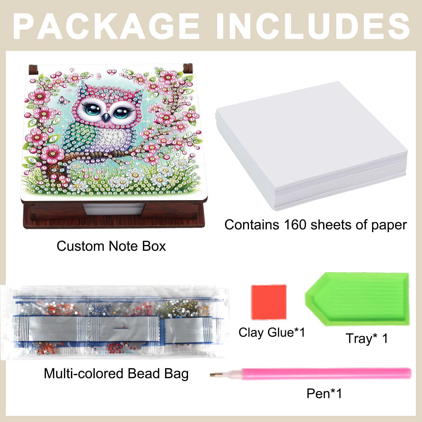 Wooden DIY Owl Diamond Painting Kit Note Box with 160 Papers for Office Desk